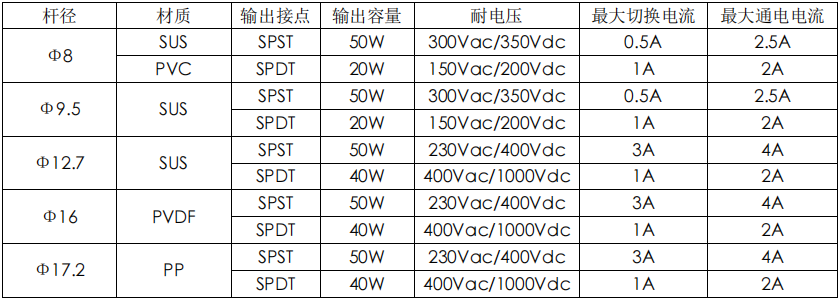 在密閉的金屬或塑料管內,設置一點或多點的磁簧開關,然后將管子貫穿一個或多個,中空而內部裝有環型磁鐵的浮球,并利用固定環, 控制浮球與磁簧開關在相關位置上,使浮球在一定范圍內上下浮動。