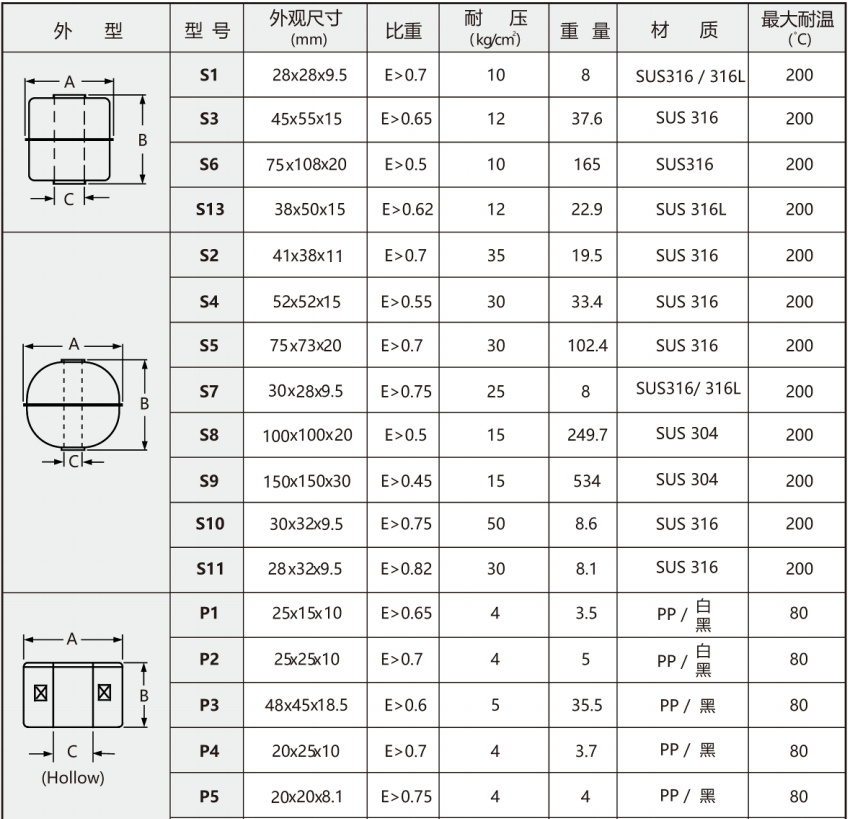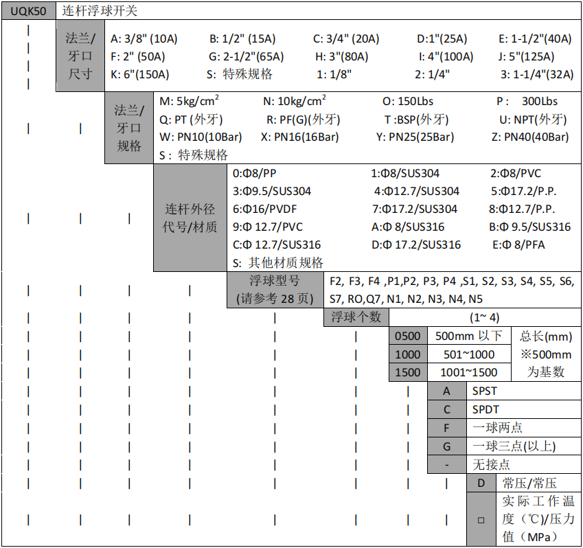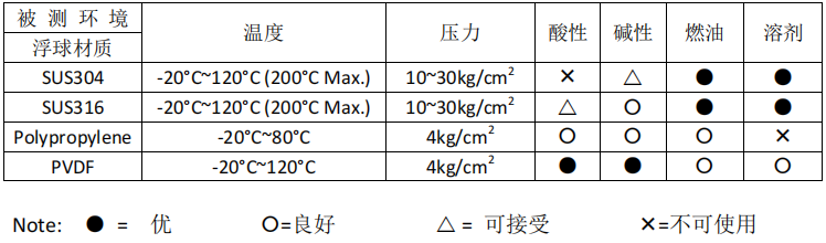 請依照被測物之使用溫度、壓力、比重、耐酸堿等特性,選用上表所列各種規格之浮球。