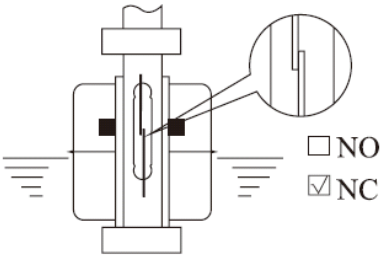 利用浮球內的磁鐵去吸引磁簧開關的接點,產生開與關的動作,作液位的控制或 指示。下圖為常閉(NC)及常開(NO)時浮球 開關的相關位置。