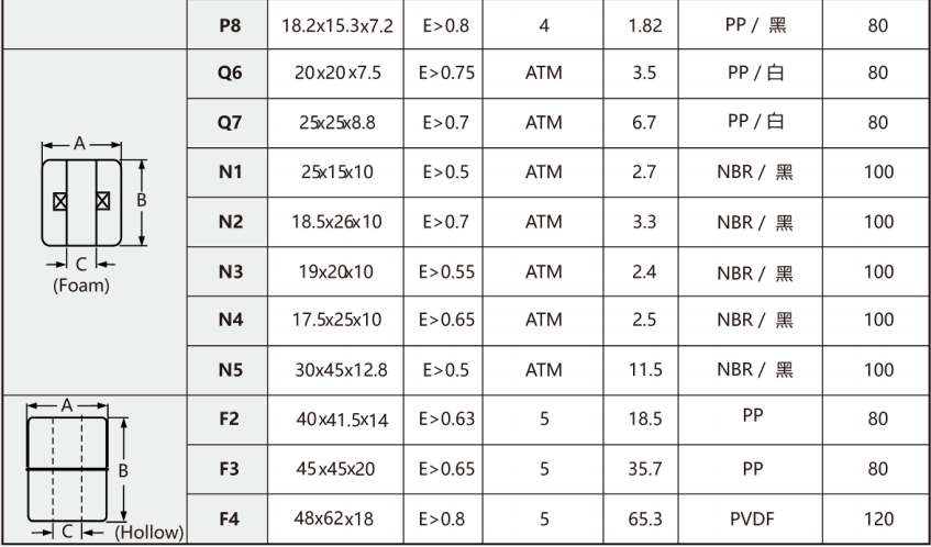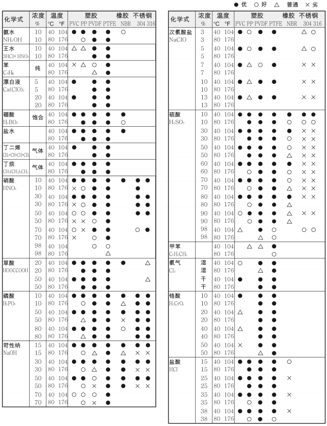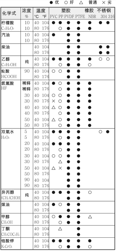 ? 溫度: PVDF 最高溫度為 120℃, PP 最高為 80℃, SUS304/316 最高為 200℃