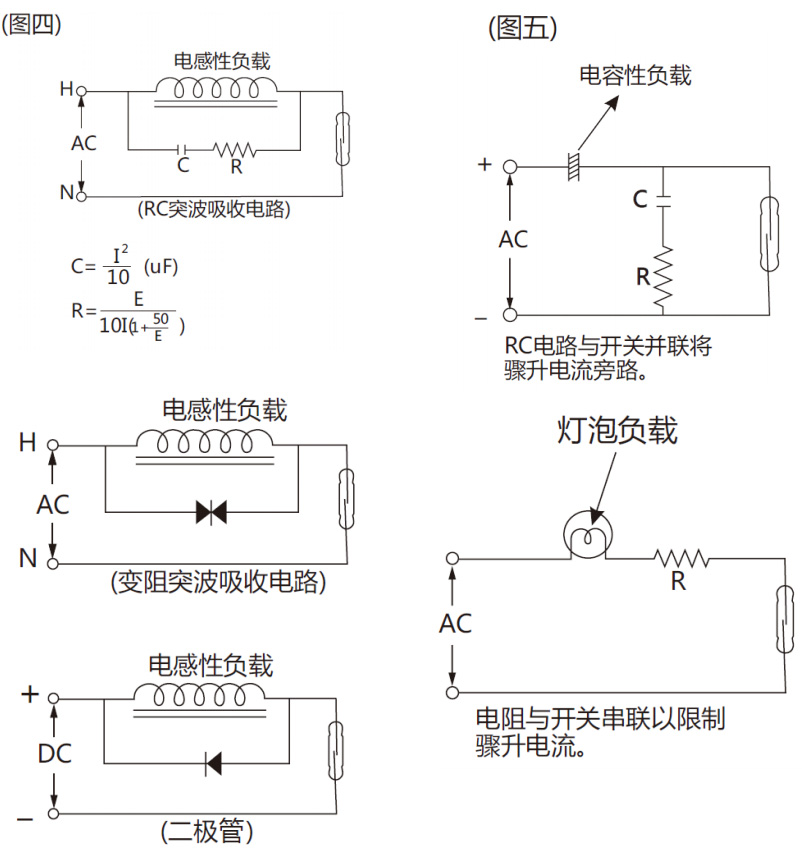 當磁簧開關使用在電容性負載的線路中如:電 容器、白熱燈炮、很長的電纜線等, 在開關的接點 間將產生一個驟升(突波)電流。因此建議一些保護 線路: 如突波吸收器或限流電阻器。(參考圖五)